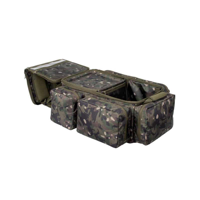 Trakker hat die Öffnung angepasst und die Schultergurte versetzt, um den Deckel des Rucksacks in einen vollständig selbsttragenden Funktionstisch zu verwandeln. Sobald der Deckel gefaltet ist, sind die Innentaschen zugänglich und in der richtigen Position für eine einfache Nutzung. Der Rucksack lässt sich in eine Workstation umwandeln, der EVA-Tisch kann in verschiedenen Positionen verwendet oder komplett abgenommen und allein als Rig-Tying-Tisch verwendet werden. Zwei Netztaschen mit Reißverschluss halten wichtiges Zubehör griffbereit. Das Hauptfach bietet einen großen Stauraum und eine zusätzliche Reißverschlusstasche, um das gesamte Equipment zu organisieren. Die lange äußere Seitentasche verfügt über eine gepolsterte Inneneinteilung zum Schutz von Alarmen und Buzz Bars, während die Außenseite eine Reihe von elastischen Schlaufen für Banksticks in verschiedenen Größen aufweist.